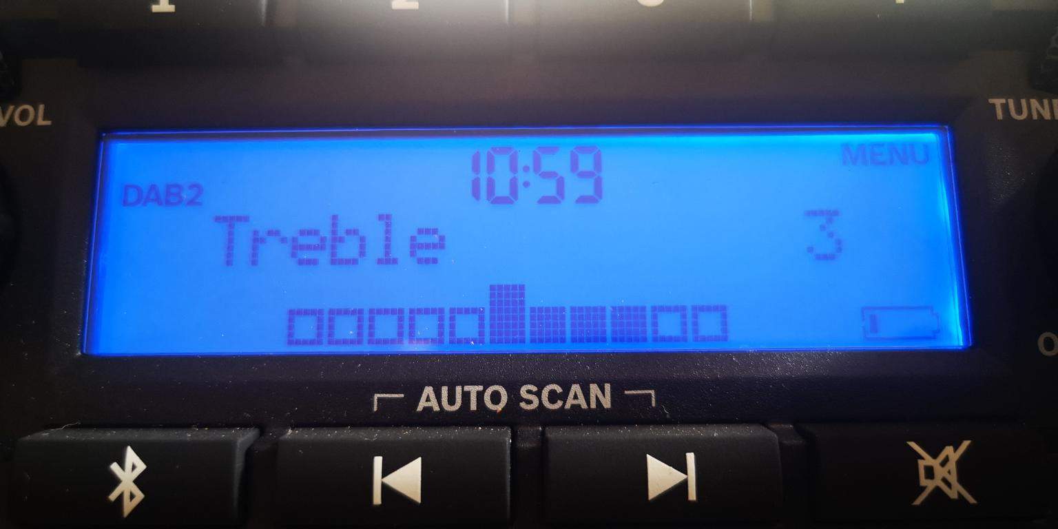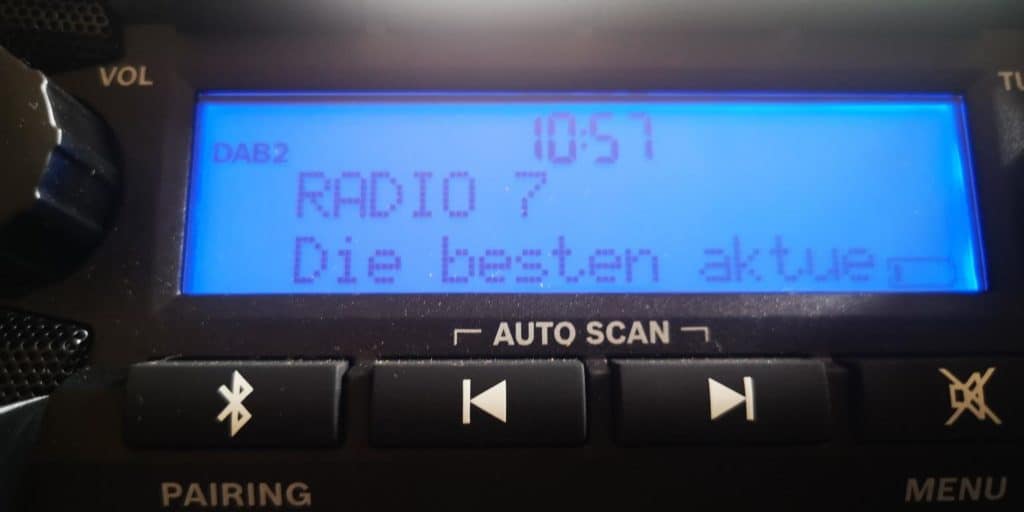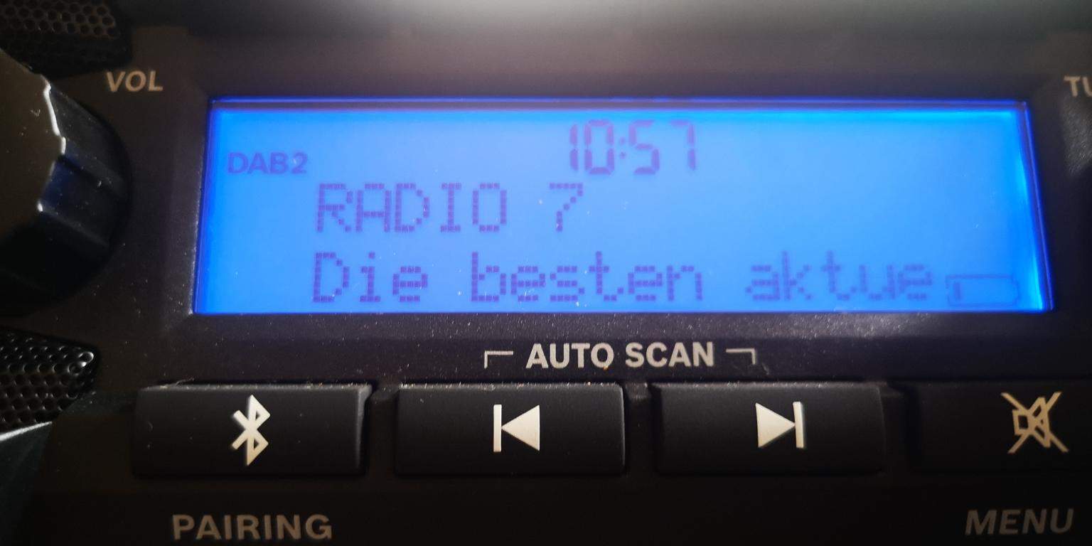 Das Display ist übersichtlich aufgebaut und zeigt die wichtigsten Dinge. Links siehst du das Programm (DAB1, DAB2, FM1, FM2, AUX oder Bluetooth), in dem du dich befindest. Oben in der Mitte wird die Uhrzeit angezeigt, die sich auch selbst via DAB stellt.