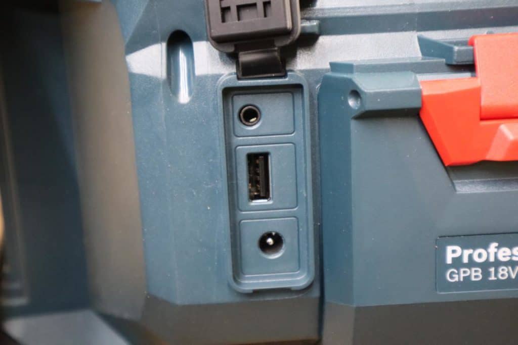 Auf der Rückseite findest du das Akkufach und die Anschlussbuchsen für AUX 18V Klinke und USB. Mit der USB Buchse kannst du aber nur dein Handy oder andere Dinge laden. Datentransfer klappt nicht.