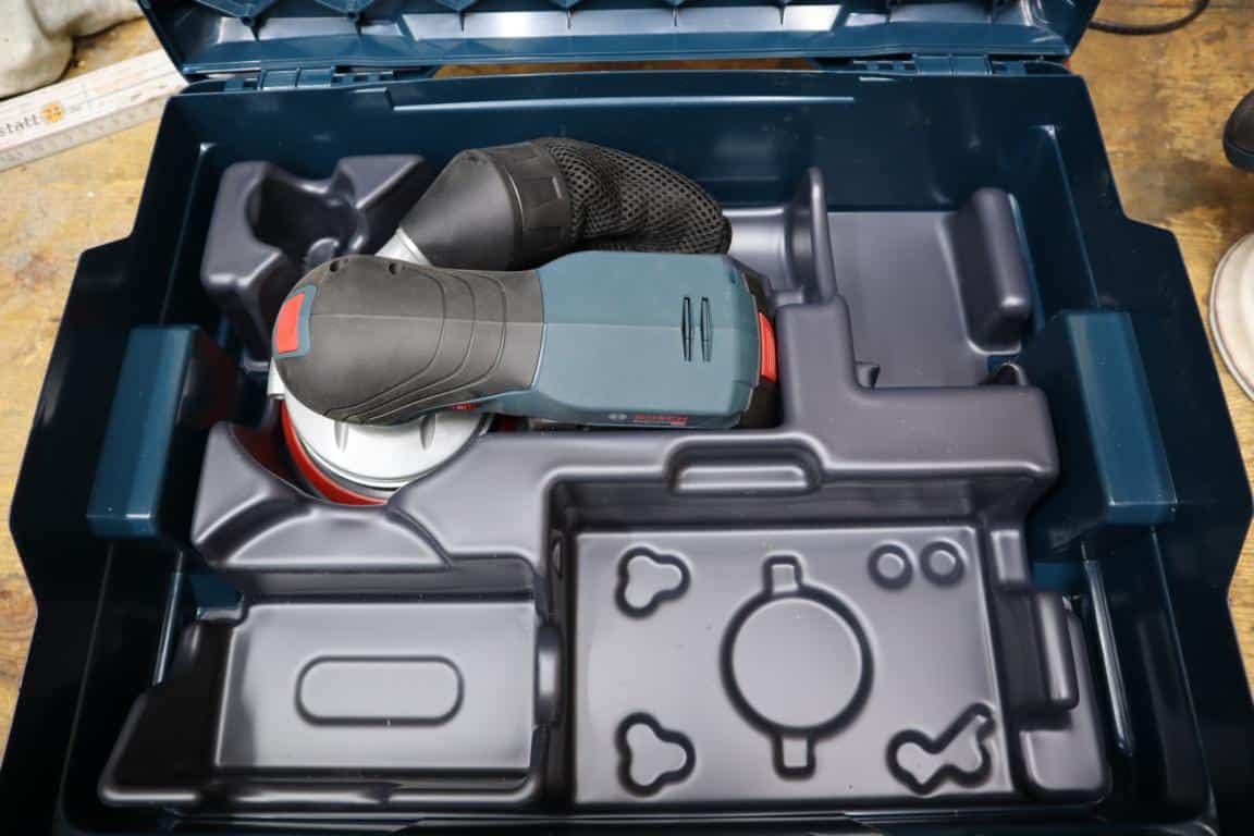Wahrscheinlich ist die Einlage für den GEX 18V-125 auch die gleiche, wie für den GEX 12V-125, da links oben ein Fach für einen 12V Akku vorhanden ist. Ansonsten passt der kleine 18V Akku-Schleifer, auch mit aufgesteckten Akku und Staubbeutel direkt in die LBoxx. Das finde ich positiv, da das bei Bosch nicht immer die Regel ist, dass man das Werkzeug komplett montiert verstauen kann.