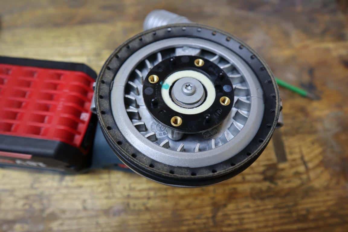 Der Schleifteller besteht aus einem weicheren Kunststoff und ist vergleichbar mit der Kabelvariante. Aber die Aufnahme unterscheidet sich wieder einmal. Beim 18V wird der Teller mit vier Schrauben befestigt. Beim GEX 125-150 AVE war es nur eine Schraube. Weiterer Wermutstropfen ist, dass beim Akkugerät kein Schlüssel enthalten ist.